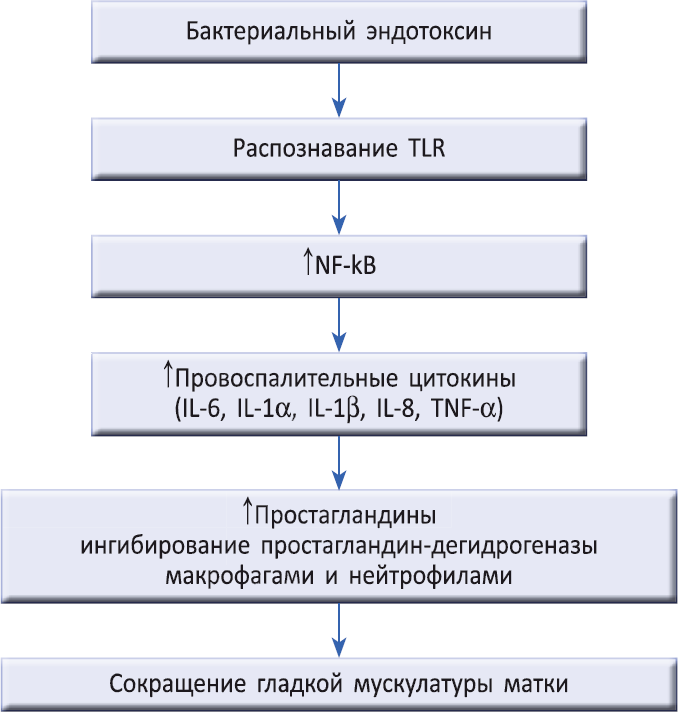 При активация TLR-4 происходит выработка провоспалительных цитокинов [41], которые вызывают апоптоз клеток трофобласта и разрушение эндотелия сосудов путем ингибирующего влияния на продукты ростовых факторов, чрезмерной цитотоксической стимуляции NK-клеток и фагоцитарной активности макрофагов в эндометрии и децидуальной ткани [42]. Повышенное количество провоспалительных цитокинов способствует усилению выработки простагландинов в амнионе и децидуальной оболочке. Механизм действия простагландинов на сократительную деятельность матки изучен недостаточно. Полагают, что их стимулирующее действие на матку реализуется путем деполяризации клеточных мембран и освобождения ионов кальция (Са2+) в миоцитах [43]. Имеются данные, что простагландины обладают лютеолитическим действием [44], то есть способствуют инволюции желтого тела и, соответственно, снижению системного уровня прогестерона, а стимуляция сокращений матки приводит к десквамации децидуальной оболочки и прерыванию беременности (рис. 1).