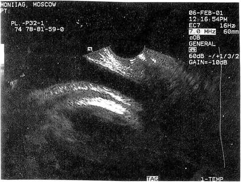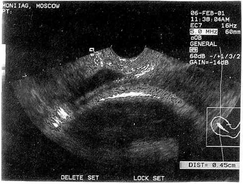 В последовом периоде эхография использовалась нами в целях профилактики патологических кровопотерь, позволяя контролировать процесс отделения плаценты.
