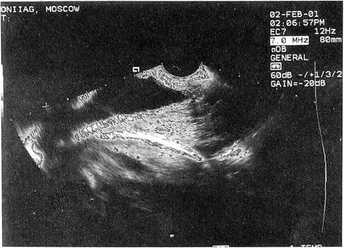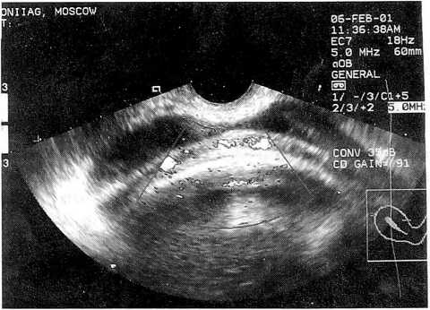 После выделения последа состояние стенок полости матки также изучалось с помощью эхоскопии, что позволило отказаться от ее контрольного ручного обследования. В сомнительных случаях или при отсутствии ультразвукового контроля данное обследование мы считаем обязательным.