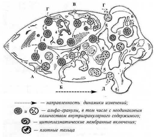 Такие варианты развития экзоцитоза вполне возможны, посколько имеются убедительные подтверждения непосредственного участия альфа- гранул и их ограничивающей мембраны в образовании плотных телец и цитоплазматических мембранных включений [3, 34], а также установленные при реакции высвобождения факты значительного увеличения площади мембранных структур комплекса ПВС, что определяет выраженное расширение его объема [24] (см. рис. 3 и 4). И идентификация в цитоплазме тромбоцитов аутофагосом (см. рис. 3), согласно лизосомальной концепции [30], в развитии основных процессов внутритромбоцитарного обмена [3], может определять еще два варианта экзоцитоза содержимого альфа-гранул (см. рис. 5). Возможность реализации этих направлений в механизме экзоцитоза подтверждает характерное появление при тромбоцитарной реакции высвобождения на плазмалемме активированных тромбоцитов специфического белка GMP-140, который в интактных тромбоцитах локализируется только в мембране, ограничивающей их альфа-гранулы [12].