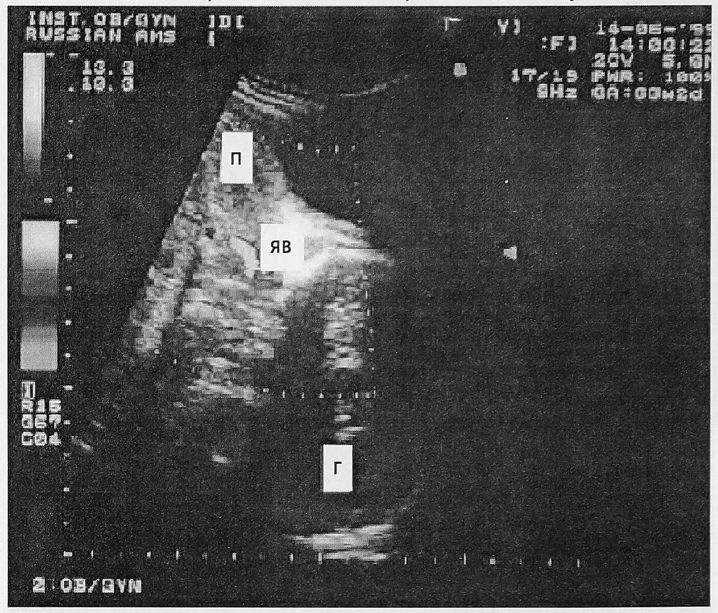 Условные обозначения: яв - яремная вена; п - позвоночник; г - голова плода
