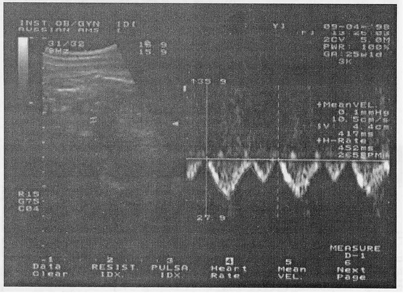 С помощью ультразвуковой допплерометрии производили анализ кровотока в яремной вене у 162 плодов с 13 по 40 неделю нормально развивающейся беременности и у 63 плодов с 28 по 40 неделю беременности, осложненной плацентарной недостаточностью и внутриутробной задержкой развития плода. С целью точной визуализации сосудов применяли цветное допплеровское картирование (ALOKA SSD 2000).