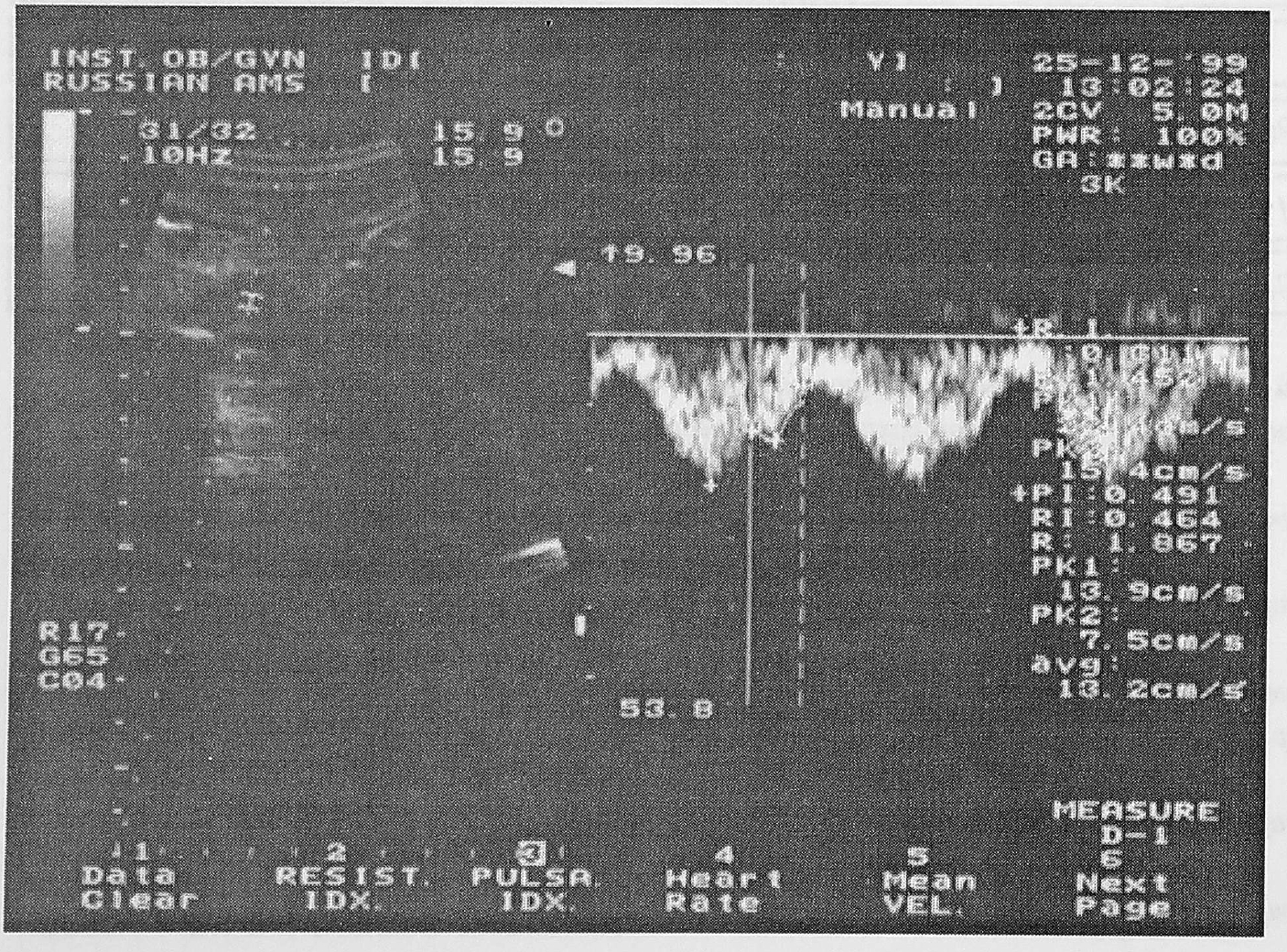При нормально развивающейся беременности и при плацентарной недостаточности спектр кровотока во внутренней яремной вене был трехфазным. При этом, у плодов при неосложненной беременности до 32 недель, регистрировался отрицательный кровоток во время сокращения предсердий, отражающий движение крови от его сердца (рис. 3)