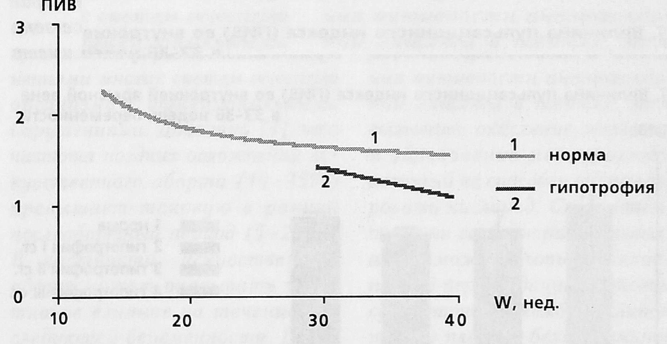 В период с 37 по 40 неделю у плодов с выраженной задержкой развития (II, III степень гипотрофии) ПИВ в яремной вене был достоверно ниже аналогичного показателя у плодов при неосложненной беременности и гипотрофии I степени (рис. 8).
