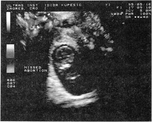 Диагноз неполного выкидыша характеризуется наличием плода с отсутствием сердечной деятельности [58] (рис. 2).