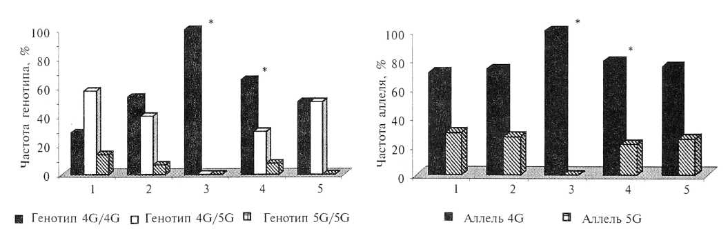 * — р < 0,05; ** — р < 0,01 по сравнению с генотипом 4G/4G.