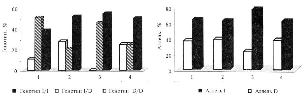 *— р < 0,05 по сравнению с генотипом I/I; **— р < 0,01 по сравнению с генотипом 1/1; *** — р < 0,01 по сравнению с генотипом I/D.