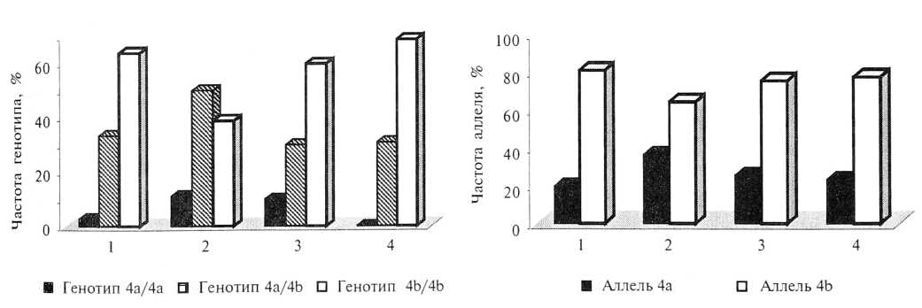 * — р < 0,05 по сравнению с генотипом 4b/4b; ** — р < 0,01 по сравнению с генотипом 4b/4b; *** — р < 0,05 по сравнению с генотипом 4а/4b; **** - р < 0,01 по сравнению с показателями до лечения.