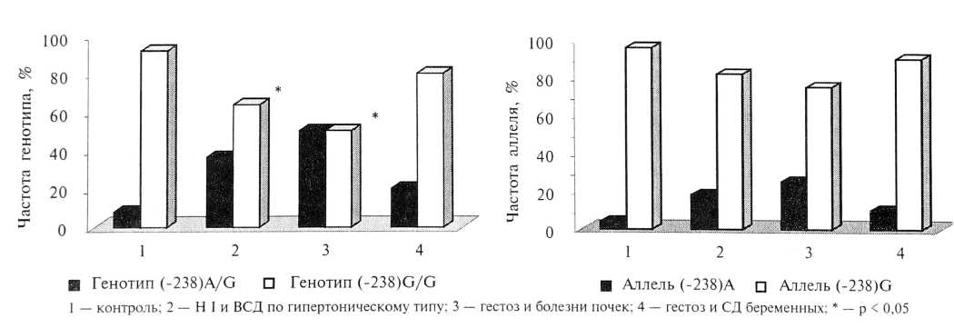 При оценке взаимосвязи данного полиморфизма со степенью тяжести чистого гестоза выявлено, что у беременных с нефропатией I степени частота гетерозигот выше, чем в контрольной группе — соответственно 11,2 % по сравнению с 7,5 % (OR=1,46; χ2=0,011), а при тяжелом гестозе (нефропатии II и выше) гетерозиготы (-238)A/G полностью отсутствуют. При сочетанном гестозе на фоне артериальной гипертензии отмечено значительное возрастание частоты гетерозигот на фоне ВСД по гипертоническому типу, при этом для легкого гестоза (нефропатия I степени) было характерно более значимое, достоверное увеличение частоты генотипа (-238)A/G до 36,3 % (χ2=8,53; OR=6,38; р < 0,05) по сравнению с более тяжелыми формами гестоза. У беременных с сочетанным гестозом на фоне заболевания почек отмечено значительное увеличение частоты генотипа (-238)A/G, причем достоверное, до 50 %, — в случаях легкого гестоза (χ2=9,97; OR=11,2 р < 0,05), тогда как все 4 беременные с тяжелым гестозом (более нефропатии II степени) на фоне почечной патологии имели генотип (-238)G/G. Наиболее значимые из полученных результатов представлены в рис. 4.