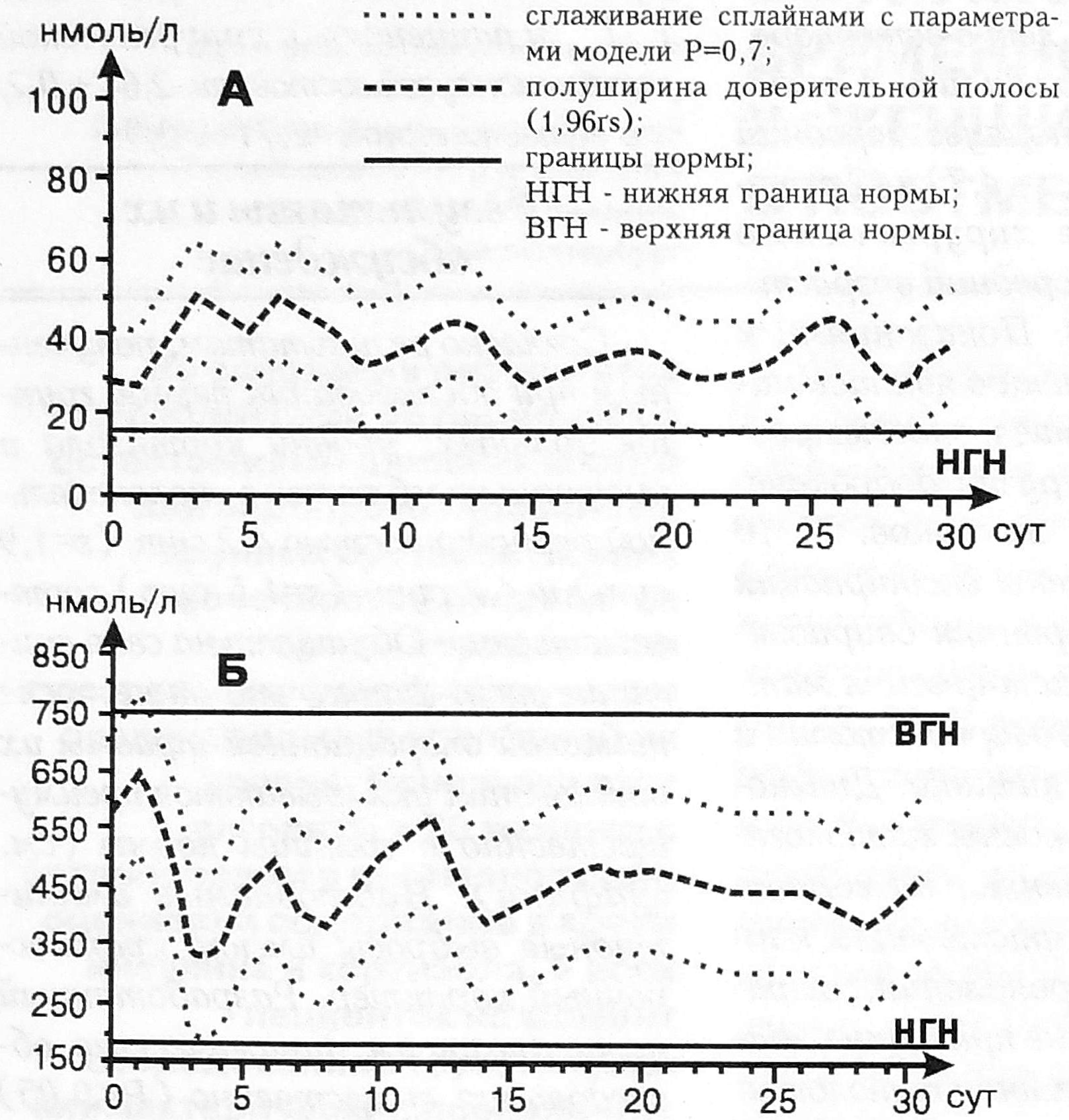Обследованы две группы больных. В первой определяли период колебаний в крови уровней инсулина и кортизола. Для этого у 58 пациенток с остеотомиями длинных костей или эндопротезированием крупных суставов нижних конечностей произвели методом РИА 157 исследований в сыворотке крови кортизола и 163 - инсулина. Забор крови осуществляли в 9 часов утра однократно до операции, а затем в динамике по скользящему графику таким образом, чтобы для каждого показателя получить динамический ряд ежедневных наблюдений в течение месяца после операционной травмы. В качестве математической модели процесса был выбран сглаживающий полиномиальный сплайн четвертого порядка (параметры модели Р=0,7, уровень значимости Р<0,05).
