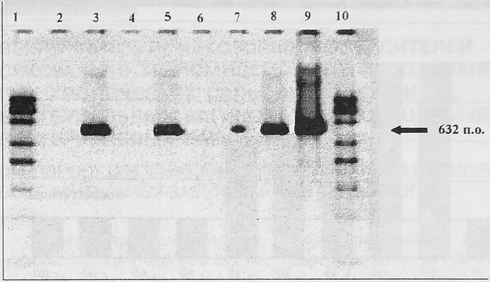 Для выявления ОПВ с помощью различных диагностических методов были обследованы 729 женщин, из них 594 - с различной патологией шейки матки (эрозия, лейкоплакия, эктропион, дискератоз). Контрольная группа состояла из 135 женщин без гинекологической патологии, обследованных с профилактической целью. Всем женщинам проводили кольпоскопическое и онкоцитологическое обследование. Выявление ОПВ проводили методом молекулярной гибридизации 2-го поколения -Hybrid capture 2 (НС2) у 470 человек (тест-системы “Digene-Murex”, США) и методом полимеразной цепной реакции (ПЦР) - у 259 человек (диагностические наборы “Биоком”, Москва). Учет и оценку результатов при выявлении ПВ методом НС 2 производили на хемилюминометре Digene DML 2000 путем вычисления величины относительных световых единиц - Relative Light Units (RLU). Количественную оценку реакции производили на основании определения соотношения RLU с положительным контролем (Positive Control -PC) - RLU/РС. Для ПЦР-диагностики из цервикального соскоба первоначально выделяли ДНК на мелкопористом стекле (Sigma) в стандартных условиях. Реакция состояла из 35 повторяющихся циклов и проводилась на амплификаторе “Perkin Elmer” 2400 (Швейцария). Продукты реакции визуализировали в электрофорезе в 6% -ном полиакриламидном геле с последующей окраской бромистым этидием и регистрацией данных с по - мощью видеоустройства “Люмен” (Россия). При выявлении ПВ/методом ПЦР в положительных пробах обнаруживали фрагмент величиной 632 пары оснований (рис.1). Выявление сопутствующих инфекций - хламидиоза, микоплазмоза, уреаплазмоза, гарднереллеза, герпеса - проводили методом ПЦР на тест-системах НПФ “Литех” (Москва).