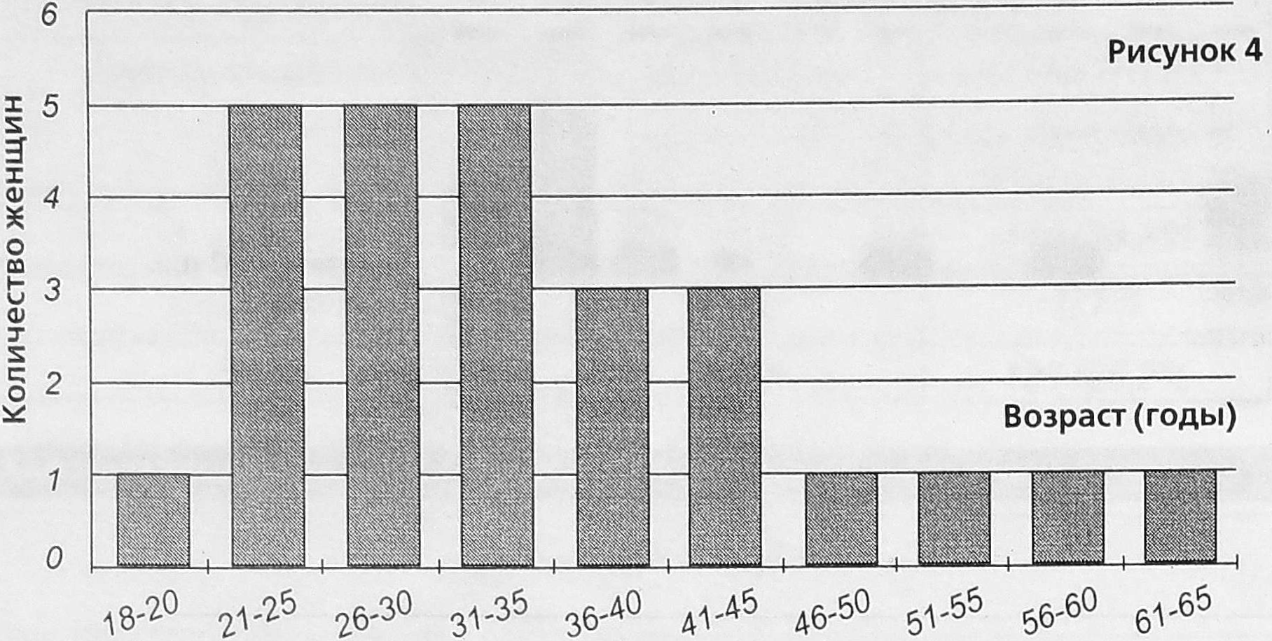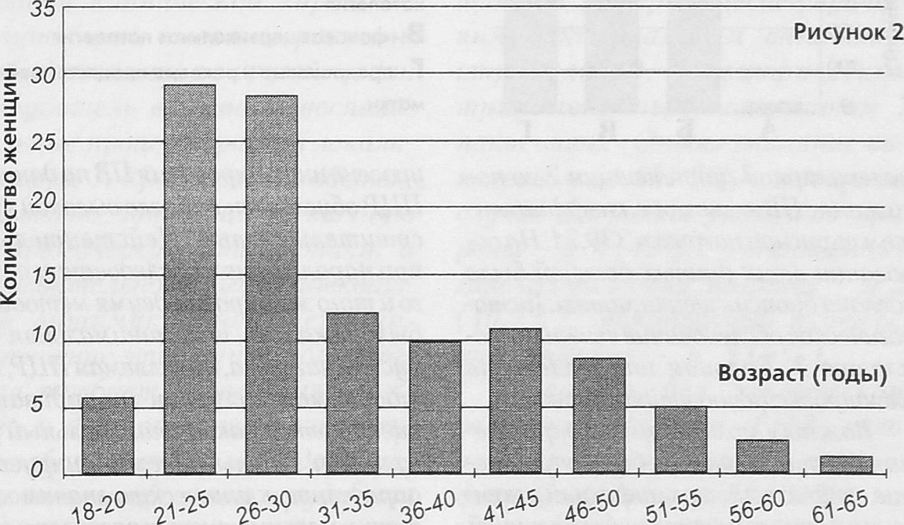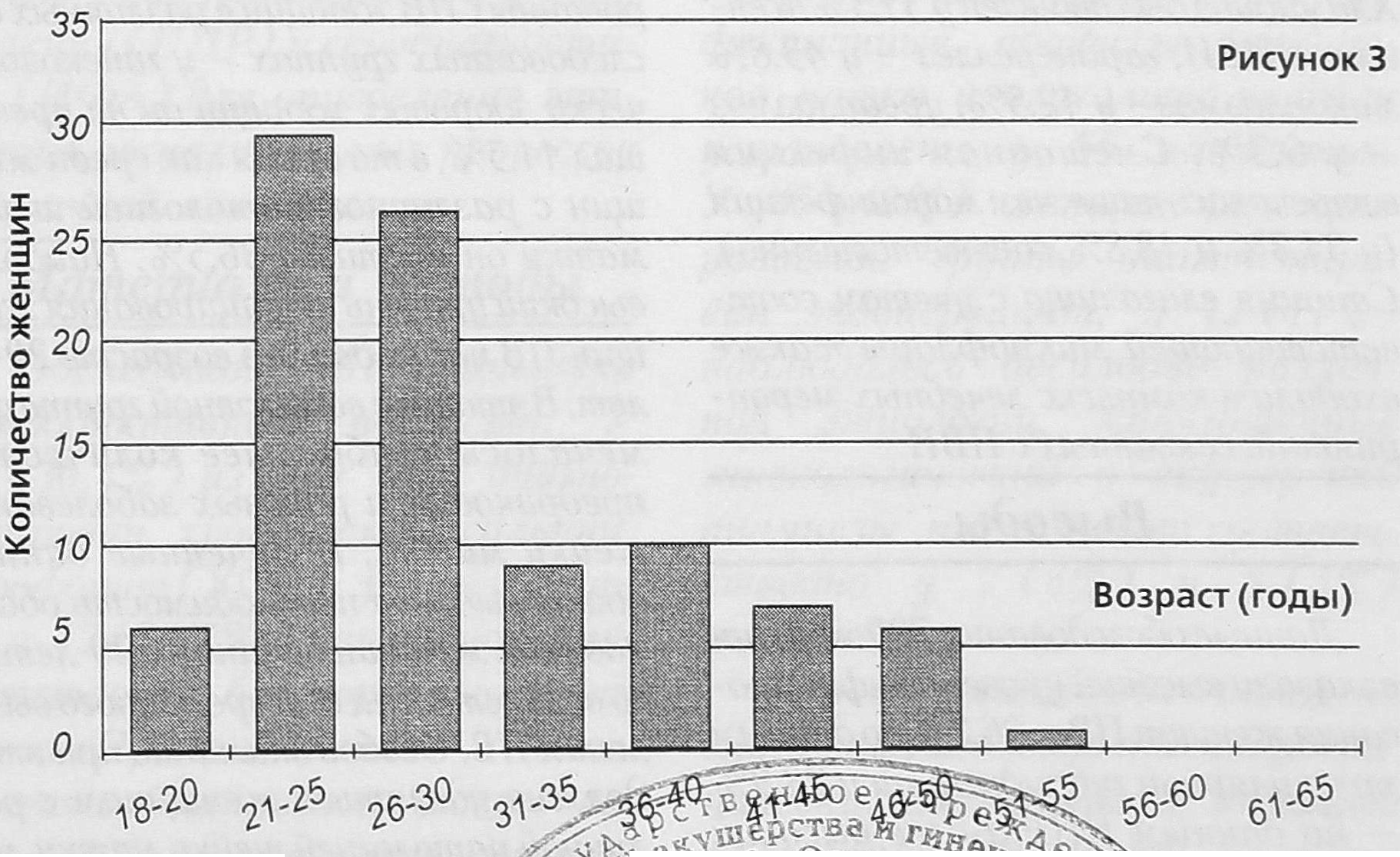 Была изучена зависимость между частотой инфицирования ПВ, наличием гинекологической патологии и возрастом. На рис. 2 представлено распределение ПВ-инфицированных женщин по возрасту, по данным обследования методом НС2- Как видно из данных рисунка, нами были обследованы женщины в возрасте от 18 до 65 лет. Пик инфицирования ПВ пришелся на 20 - 30 лет. С возрастом число ПВ-инфицированных женщин постепенно снижалось.