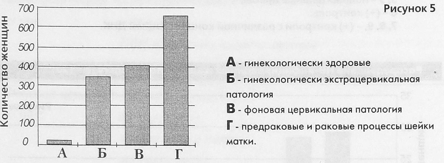 Как видно из данных рис. 5, уровень вирусной нагрузки был минимальным у гинекологически здоровых женщин и резко возрастал при различной гинекологической патологии. Средний уровень вирусной нагрузки 344,9 RLU/PC наблюдался у женщин с гинекологической патологией, не затрагивающей шейку матки. У женщин с фоновой патологией шейки матки (эрозия, эндоцервикоз, эндоцервицит) средний уровенъ вирусной нагрузки составил 404,6 RLU/PC. Максимальным был уровень вирусной нагрузки у женщин с дисплазиями различной степени тяжести и Са in situ - он составил 656,6 RL U/PC. Имеющаяся зависимость между вирусной нагрузкой и степенью выраженности процесса может служить дополнительным критерием для более внимательного обследования таких женщин, включая повторное онкоцитологическое и гистологическое обследования для исключения возможности ложноотрицателъных результатов при первичном обследовании.