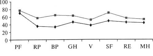 Качество жизни больных с ХТБ после операции также оставалось значительно ниже, чем в группе сравнения (диаграмма 4). Достоверные различия получены по всем шкалам, за исключением влияния эмоционального состояния на ролевое функционирование.