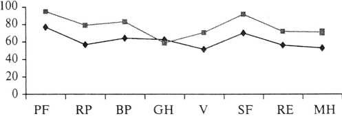 Качество жизни больных с ХТБ перед оперативным вмешательством было значительно ниже, чем у больных миомой матки (диаграмма 3). Достоверные различия получены по всем шкалам опросника, за исключением шкалы физическое функционирование и влияние эмоционального состояния на ролевое функционирование.