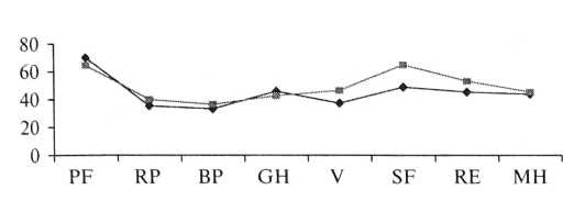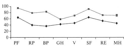 Исходное качество жизни больных с ХТБ значительно ниже, чем у больных миомой матки. Это снижение происходит, очевидно, не только из-за наличия непосредственно боли, но и из-за выраженных аффективных расстройств, ее сопровождающих. Также на качестве жизни отражается более низкий социальный статус больных с ХТБ. Недостоверные различия получены лишь по шкале, отражающей PF и RE. Первое, очевидно, связано с наличием в обеих группах выраженных соматических симптомов (боль, астенические проявления, дисменорея в основной группе и последствия анемизации в группе сравнения). Отсутствие достоверной разницы влияния эмоционального фактора на повседневную деятельность связано с тем, что больные миомой матки перед оперативным лечением также испытывают ситуационные депрессивные и тревожные переживания.