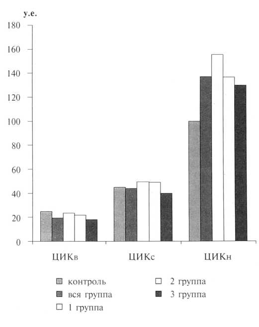 Показатели иммуноглобулинов классов А, М, G (рис. 4) были в норме, однако уровень секреторного иммуноглобулина A (slgA) был повышен во всех исследуемых группах, что объясняется наличием воспалительного процесса в слизистой эндометрия и особенностями иммунитета слизистых. Отмечалось повышенное содержание ЦИКн во всех исследованных группах по сравнению с контрольной (рис. 5).