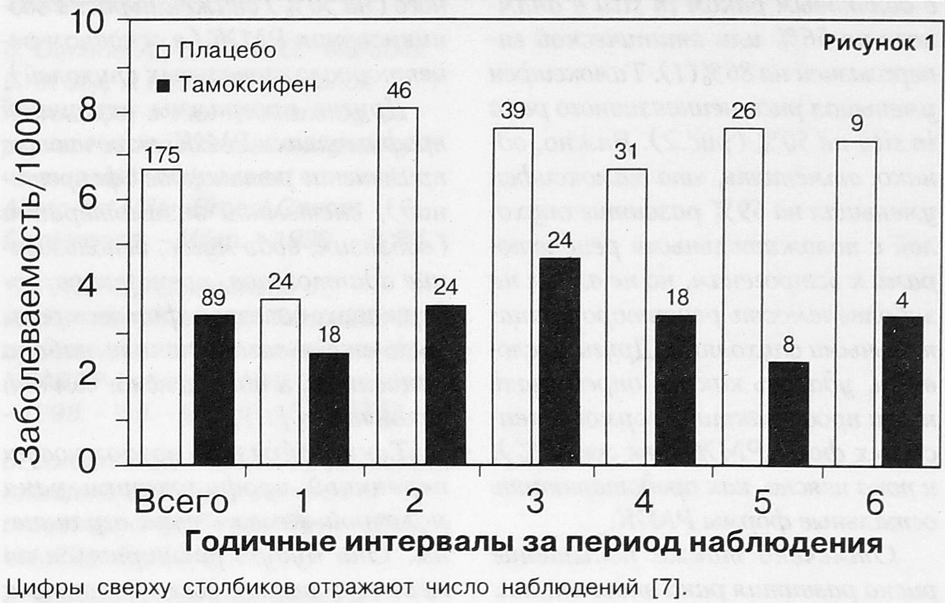 Рис. 1. Заболеваемость инвазивным раком молочной железы у участников исследования, получавших плацебо или тамоксифен.