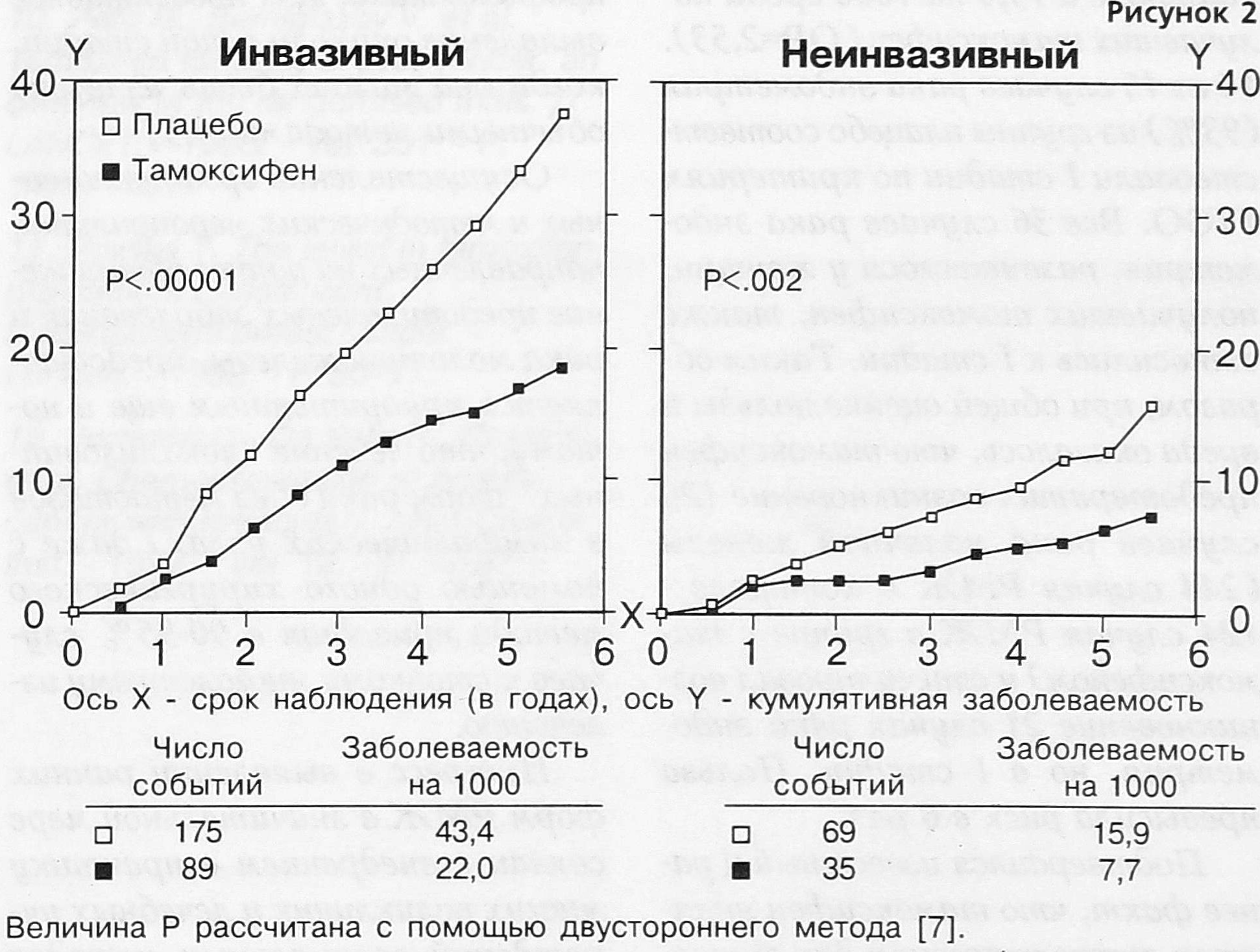 Рис. 2. Кумулятивная заболеваемость инвазивным и неинвазивным раком молочной железы у женщин, получавших плацебо или тамоксифен.