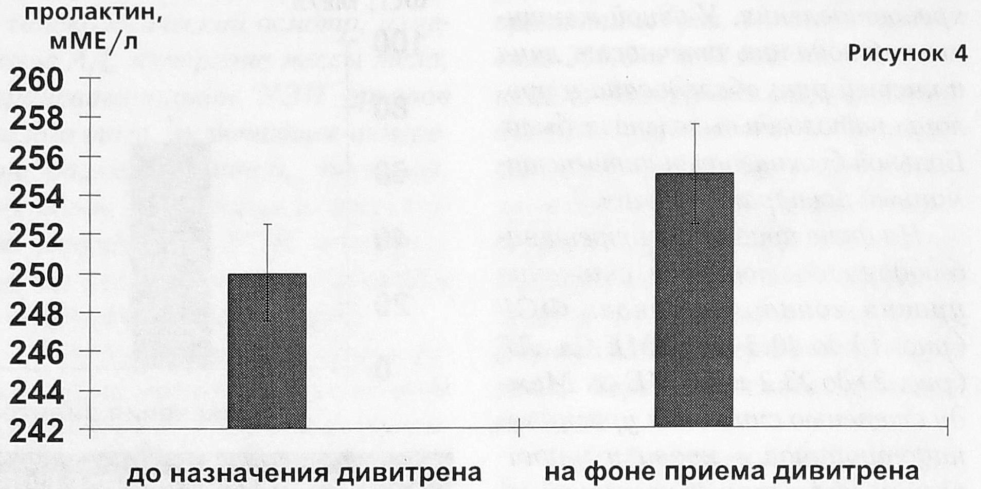 На фоне приема дивитрена наблюдали достоверное снижение уровня гонадотропинов: ФСГ (рис. 1) до 40,3 ±5,2 МЕ/ л, ЛГ (рис. 2) до 23,2 ±3,6 МЕ/л. Между степенью снижения уровня гонадотропинов в крови и клиническим эффектом достоверной зависимости не наблюдалось. Содержание эстрадиола (рис. 3) повышалось и составляло 186,6 ± 21,9 пмоль/л. Содержание пролактина (рис. 4) составляло 255,3 ± 42,4 МЕ/л. Достоверной разницы выявлено не было.