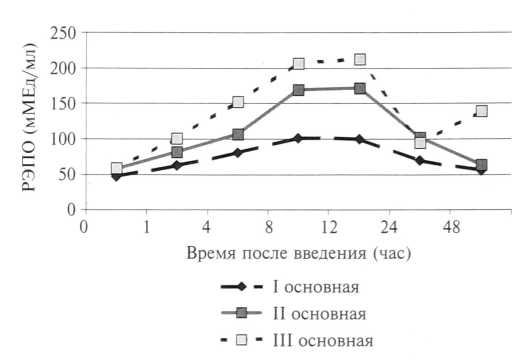 После первой инъекции эпокрина во всех группах уже через час выявлено достоверное повышение концентрации РЭПО в сыворотке крови. Степень повышения концентрации РЭПО различалась в наблюдаемых группах и была прямопропорциональна стартовой дозе эпокрина. Максимальное содержание РЭПО в сыворотке наблюдалось в группах, где использовалась наибольшая стартовая доза препарата (150 Ед/кг). Указанная закономерность сохранялась в группах беременных и родильниц через 4, 8 и 12 часов после первой инъекции эпокрина.