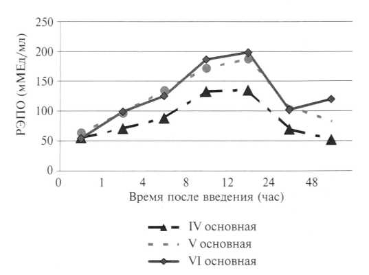 По некоторым данным, биодоступность препарата различается в зависимости от способа его введения. После подкожной инъекции сывороточная концентрация РЭПО значительно ниже, чем при внутривенном введении, уровень РЭПО медленнее повышается и достигает пика между 12 и 18 часами [13]. В то же время исследования A. Huch [40] показали, что подкожное введение РЭПО не менее эффективно, чем внутривенное.