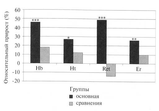 Рис. 3. Относительный прирост гематологических показателей у беременных через 40 дней от начала курса лечения эпокрином