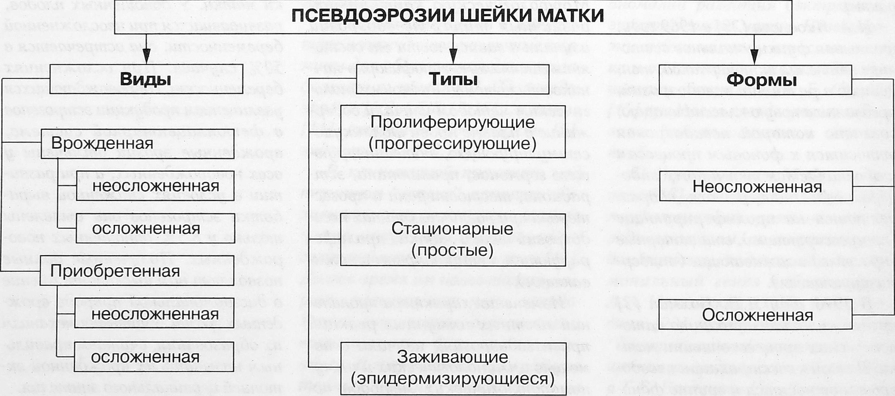 Проведенные многофакторные исследования в онтогенезе позволили нам предложить этиологически, патогенетически, морфологически и клинически обоснованную классификацию псевдоэрозий шейки матки, представленную на рисунке.