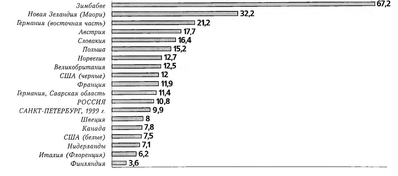 Располагая данными МАИР за период с 1988 по 1992 годы по заболеваемости раком шейки матки в странах мира, мы представляем их в сопоставлении с показателями Санкт-Петербурга в 1999 году (рис. 2).