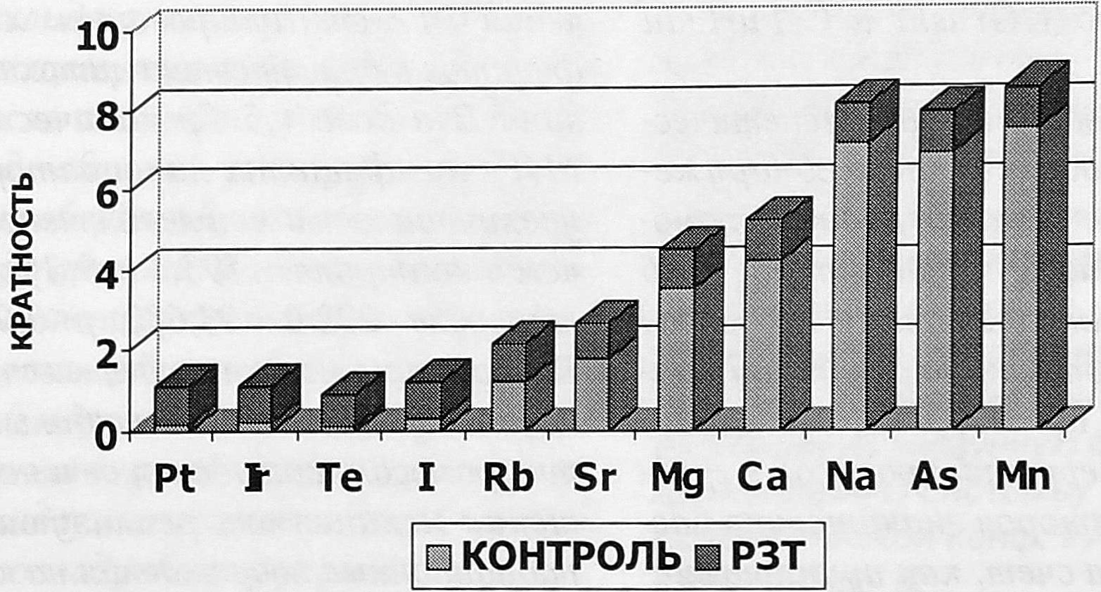 При статистическом анализе установлено, что наиболее значимые различия между показателями в обеих группах имеются по Na, As, Mg, Са, Те, Ir, Pt, и I (см. рисунок), причем в исследуемой группе концентрация Na, As, Mg, Мп, и Са в тканях хориона была значительно ниже, а концентрация Те, Ir, Pt, и I - наоборот, превышала аналогичные показатели в группе сравнения.