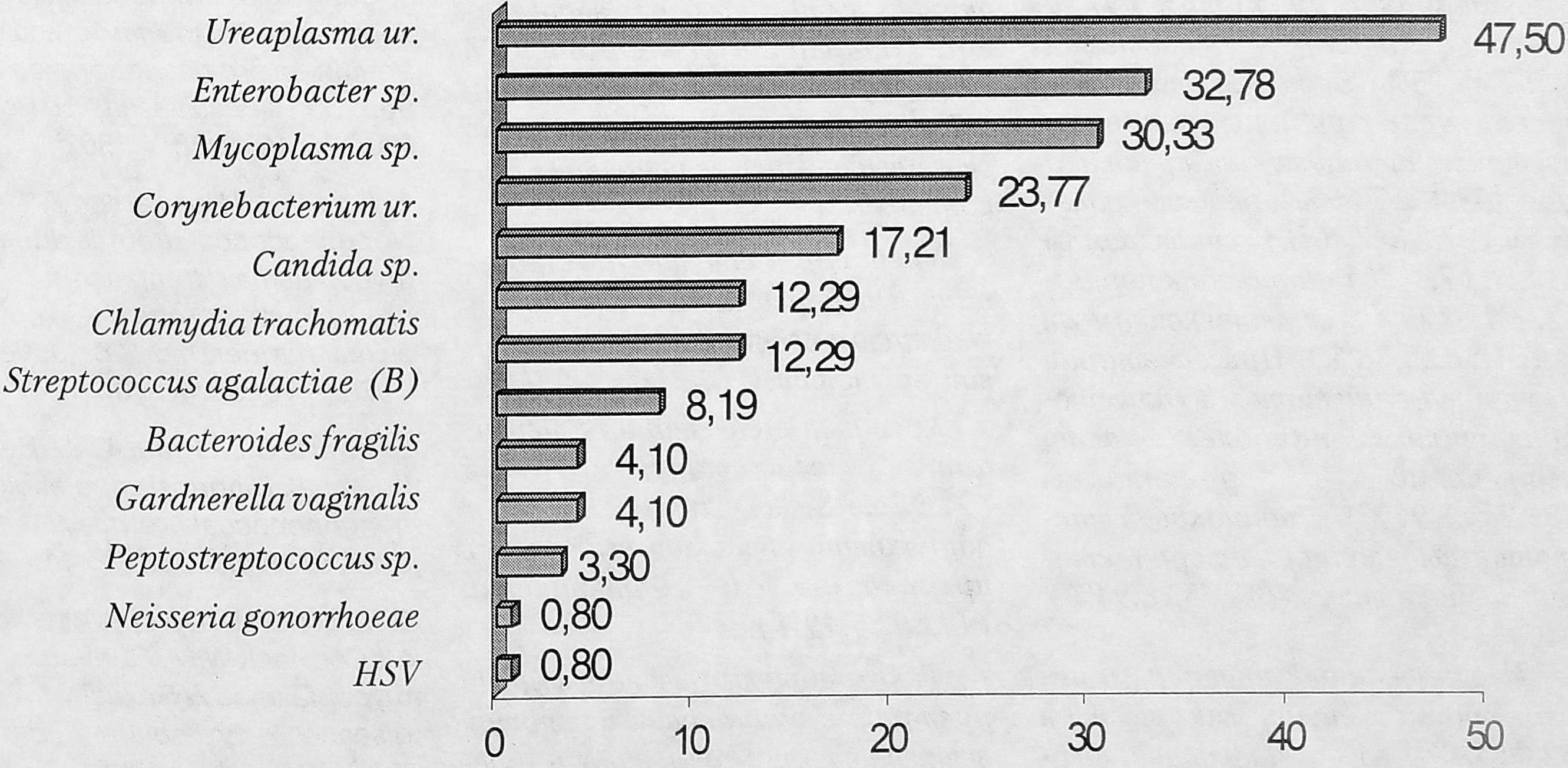 У беременных женщин сочетание уретрита с кольпитом имело место в 12 случаях (16,0+4,26%). При этих заболеваниях важная этиологическая роль принадлежит уреаплазмам (12,0+3,75%), микоплазмам (6,67±2,88%), энтеробактериям, стрептококкам гр. В и коринебактериям (5,33±2,59%). При уретрите в сочетании с эндоцервицитом преобладали уреаплазмы и энтеробактерии (12,0+3,75%), коринебактерии (37,50±12,50%) и М. hominis (6,67+2,88%).