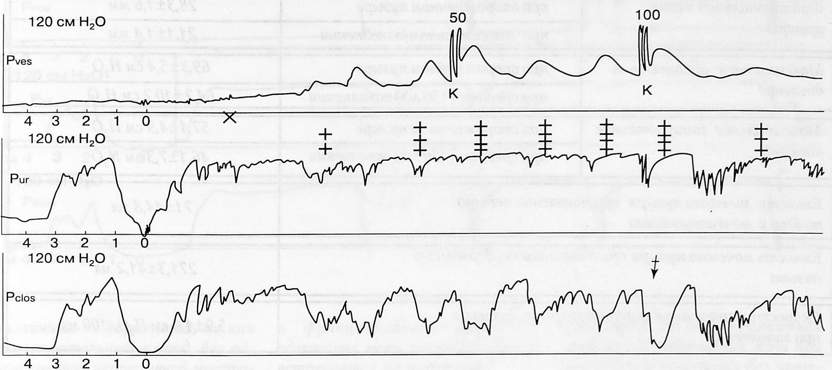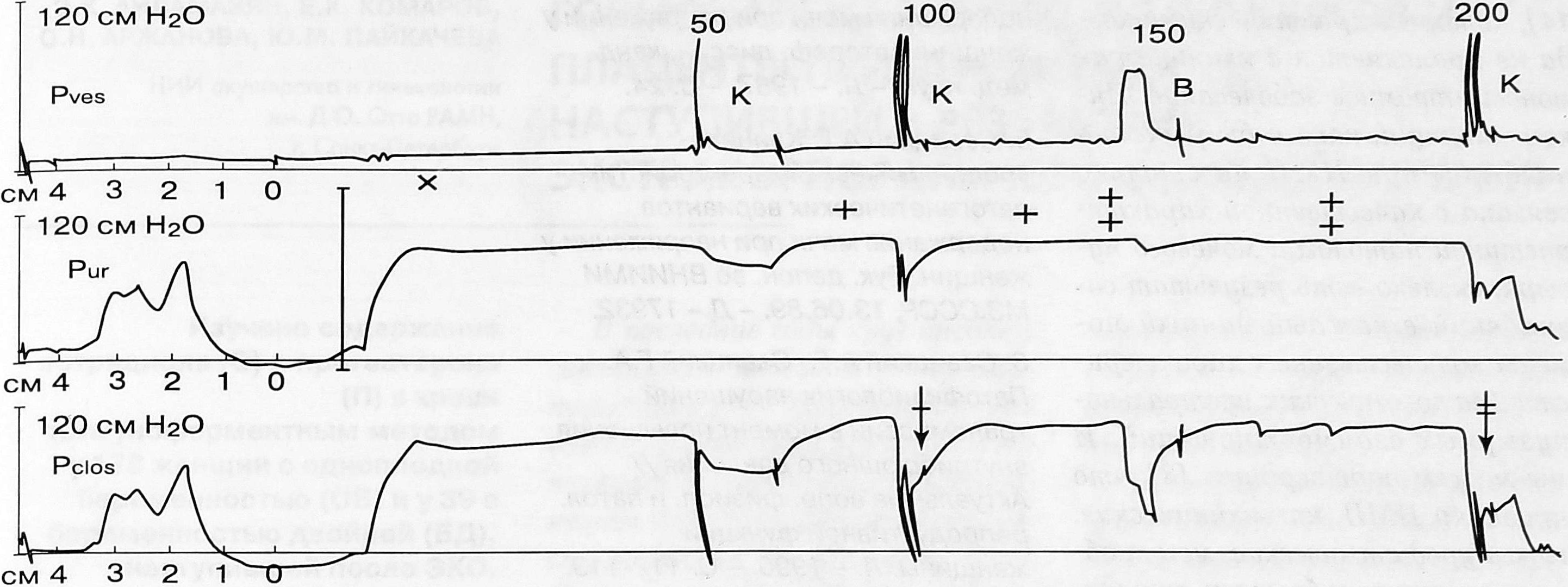 - Самопроизвольные сокращения детрузора, которые больная не в состоянии подавить, часто могут сопровождаться релаксацией сфинктерного аппарата уретры, что приводит к снижению запирательного давления. Реже возникает рефлекс стимуляции уретральных мышц; при этом внутриуретральное давление может остаться на прежнем уровне либо несколько повыситься, что может создать ложное впечатление об отсутствии реакции уретры на повышение внутрипузырного давления.