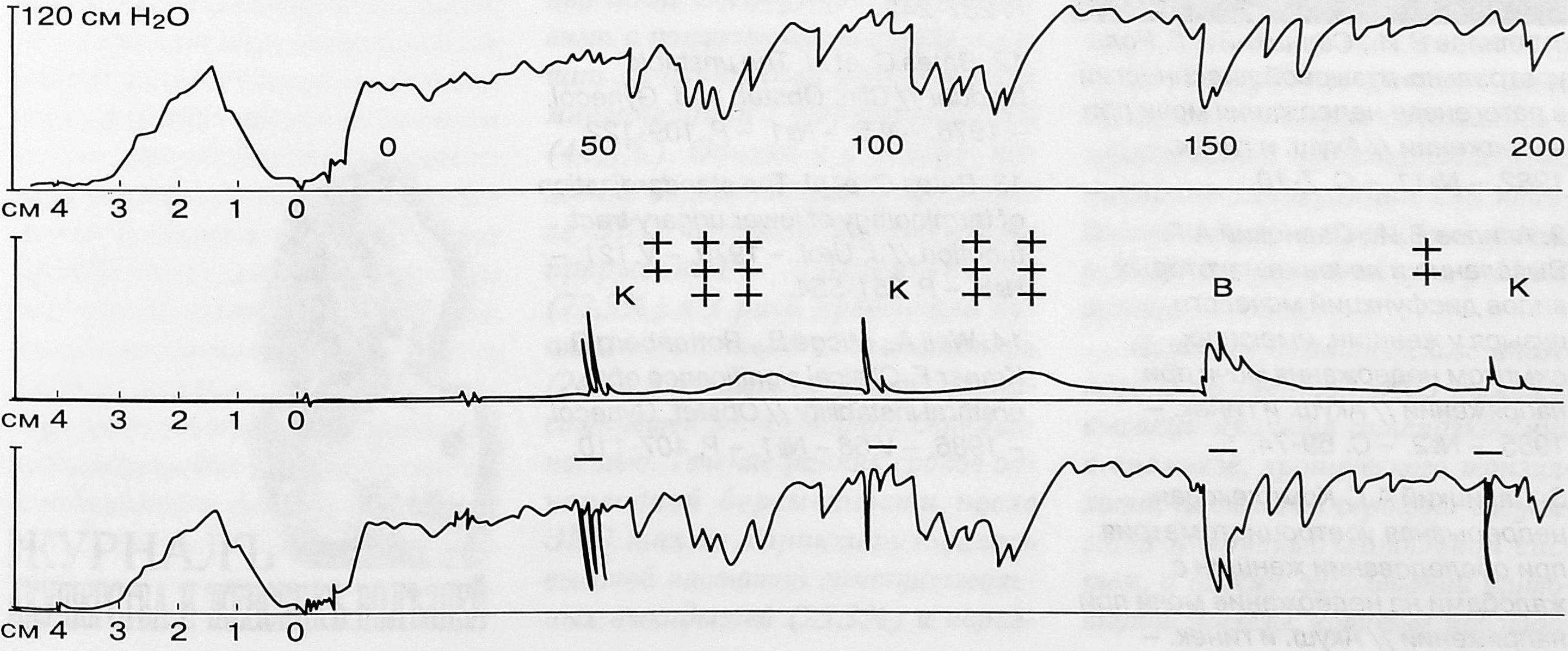 При уродинамическом обследовании (техническое и методическое обеспечение которого неоднократно описано нами в литературе [2, 3, 4, 5, 6, 8]) мы выяснили, что существует множество ситуационных вариантов уретрально-пузырных: взаимоотношений, при которых гипертонические реакции нестабильного детрузора могут привести к непроизвольной потере мочи в момент физического напряжения. На рис. 1 и 2 демонстрируются два маргинальных варианта НМП, выявленных у женщин с симптомом недержания мочи при напряжении при средних степенях заполнения мочевого пузыря. Важно то, что обе эти женщины не имели органической патологии запирательного аппарата уретры. Функциональная длина уретры, максимальное уретральное и запирательное давление не выходили за пределы возрастной нормы. На рис. 1 видно, что уже в самом начале заполнения мочевого пузыря на фоне быстро нарастающих по интенсивности позывов к мочеиспусканию имелись выраженные, довольно длительные сокращения мочевого пузыря, которые возникали одновременно с возрастанием базального тонуса детрузора. Каждое фазное сокращение мочевого пузыря приводило к реакции релаксации уретры. Как видно из динамики запирательного давления, во время эпизодов релаксации уретры оно периодически снижалось до критических величин. В момент одного из таких снижений, совпавших по времени с резким подъемом внутрибрюшного давления (кашель), наблюдался эпизод непроизвольного истечения мочи из уретры. Важно отметить, что снижение давления в уретре во время ее релаксации, совпадающее по времени с самопроизвольным сокращением детрузора, не было очень значительным. Отрицательные девиации запирательного давления обусловливались существенной величиной внутрипузырного давления, складывавшейся из базального и фазного компонентов во время сокращения детрузора. Эта уретроцистометрограмма является объективным доказательством существования недержания мочи при напряжении пузырного происхождения [14], в основе которого лежит один из патофизиологических вариантов нестабильности детрузора. На рис. 2 демонстрируется уретроцистометрограмма женщины, у которой при опорожненном мочевом пузыре запирательное давление в уретре составляло 60 см вод. ст. По мере заполнения мочевого пузыря оно прогрессивно возрастало и к 200 мл достигло 90 см вод. ст.