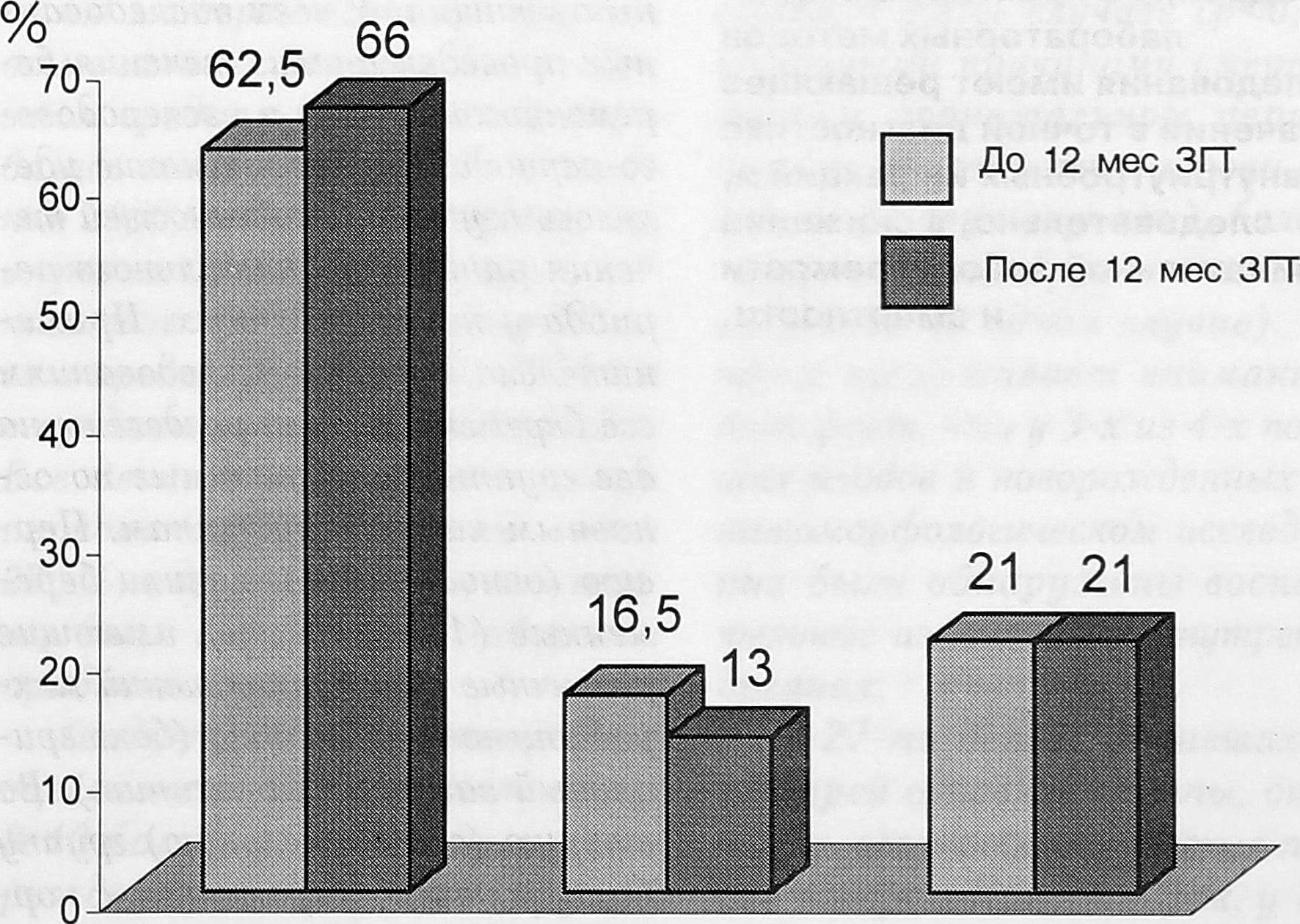 Анализируя данные ЭХО-КГ и Допплер-ЭХО-КГ о внутрисердечной гемодинамике в процессе лечения, следует отметить, что эти изменения носили менее выраженный характер по сравнению с показателями функционального состояния ССС, что свидетельствует о глубине и выраженности морфофункциональных изменений, возникающих в миокарде под действием дисгормоналъных нарушений. Однако следует отметить положительную тенденцию - уменьшение случаев начальных нарушений диастолической функции левого желудочка (с 16,5% до13%), что подтверждает возможную обратимость данных нарушений именно на стадии начальных изменений и отсутствие таковой на стадии замедленной релаксации (21% до и после лечения) (рис. 1). У пациенток с данным типом нарушения диастолической функции, однако, не произошло дальнейшего ухудшения релаксации миокарда. Эти данные нуждаются в дальнейшей проработке, а также в сравнении с пациентками, по ряду причин не получавшими ЗГТ.