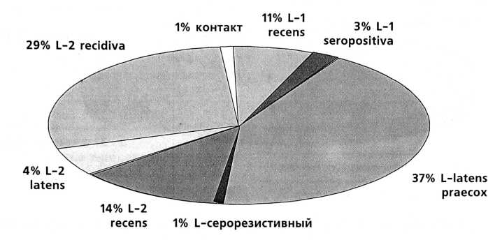 Выявленные в ходе клиниколабораторного обследования пациенток формы сифилиса распределялись следующим образом: Lues latens praecox — 37%, Lues-2 recidiva — 29%, Lues-2 recens — 14%, Lues-1 recens —11%, Lues-2 latens — 4%, Lues-1 seropositiva — 3%, серорезистивный Lues — 1%, сифилис no контакту — 1% (рис. 3).