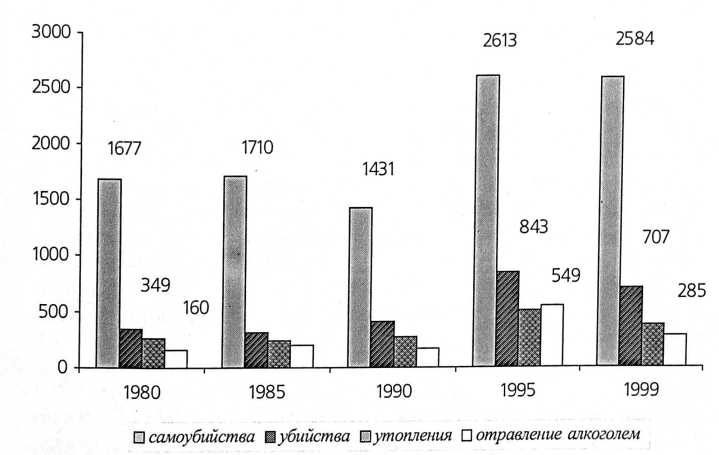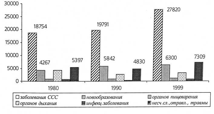 Наиболее ярко прослеживаются указанные аспекты в структуре причин смерти мужского населения, на которое приходится наибольший прирост смертности. 40,8% мужчин умирают в работоспособном возрасте, определяющем репродуктивное поведение. При снижении удельного веса умерших мужчин в возрасте до 25 лет в более чем 2 раза, возросла доля умерших в возрастной группе от 30 до 45 лет. Мужчины чаще умирают от насильственных причин и раньше —от болезней системы кровообращения. К социальным последствиям высокой смертности относится широкое распространение вдов ства и сиротства [3].