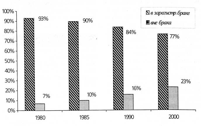 Характер рождаемости в республике определяется рядом ключевых моментов, оказывающія непосредственное влияние на реі родуктивное здоровье и репродуктивное поведение: массовое paспространение малодетности снижение суммарного коэффициента рождаемости, сближени параметров городской и сельской рождаемости, откладывание сро ка рождения первого ребенка, рост внебрачной рождаемости, изменение возрастных коэффициентов оптимальных в репродуктивном отношении групп женщин. Изменение характера репродуктивного поведения населения имеет существенное значение в аспекте организации акушерско-гинекологической помощи. [4]. Прогрессирующее снижение числа браков до 6,3 (на 1000 населения) сочетается с высоким уровнем разводов до 3,4 (на 1000 населения), практически распадается каждый второй зарегистрированный брак. Изменение морально-этических норм и нравственных ценностей современной молодежи привели к утрате традиционной значимости института семьи. Дети, родившиеся у матерей не состоявших в зарегистрированном браке, составляли в 1980 г. 7% от общего числа новорожденных, в 2000 г. их удельный вес возрос до 23%, это каждый четвертый ребенок (рис. 4).