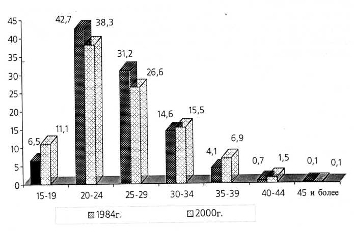 Не всегда женщина, решившая родить ребенка вне брака, имеет оптимальные, комфортные условия для благополучного течения беременности и родов. Чаще всего в данной ситуации будущая мать нуждается не только в квалифицированной акушерской помощи, но и социальной, психологической консультации и даже реабилитации. Это диктует необходимость совершенствования и расширения консультативной помощи в условиях женских консультаций. За последние 13 лет в республике регистрируется изменение в структуре возрастного состава родильниц. Удельный вес женщин в возрастной группе 15-19 лет увеличился на 45%,35-39 лет — на 41%, 40-44 года -на 47%. Доля матерей оптимального для деторождения возраста 20-29 лет снизилась на 15% (Рис. 5).