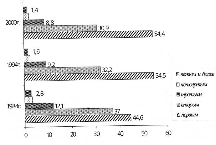 Рис. 6. Динамика распределения родившихся по порядкѵ рождения (в% к итогу)