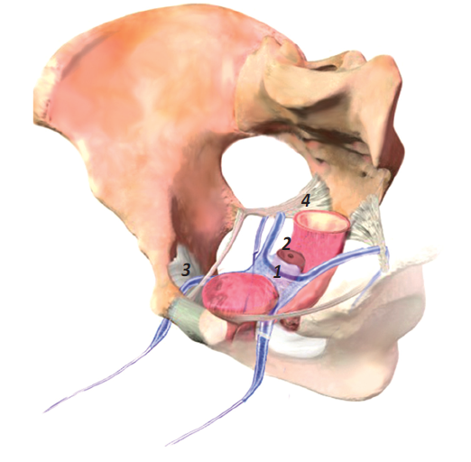 Рис. 1. Схема положения эндопротеза Пелвикс передний: 1 — эндопротез, 2 — шейка матки, 3 — обтураторная мембрана, 4 — крестцово-остистая связка
