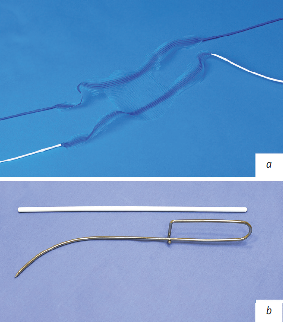 Рис. 2. Эндопротез Пелвикс передний (а); инструмент Урофикс ПЛ и трубчатый туннелер (b)