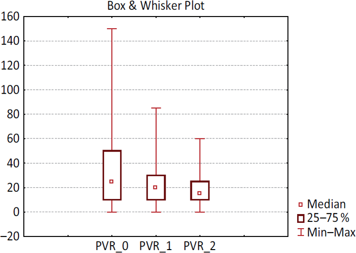 Рис. 4. Динамика значения объема остаточной мочи. PVR_0 — значение до операции; PVR_1 — значение через 12 месяцев; PVR_2 — значение через 24 месяца