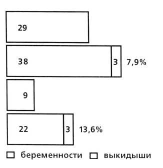 Настоящая беременность самопроизвольно прервалась у каждой седьмой пациентки, уже имеющей в анамнезе выкидыш после предшествующего искусственного аборта и у каждой тринадцатой после самопроизвольного выкидыша без предшествующего искусственного аборта (рис. 1).