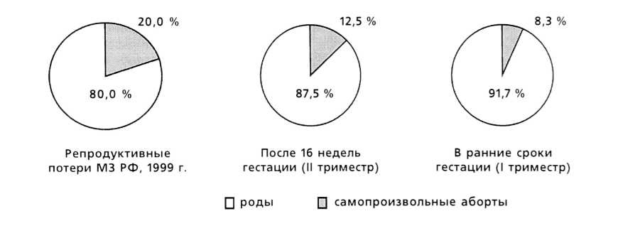 Свидетельствами неблагополучия в этой области являются данные о реализации репродуктивной функции женщин: ухудшение состояния здоровья беременных, что в значительной мере определяет высокий процент перинатальных потеръ. Только 25% первородящих являются первобеременными, то есть у 75% женщин акушерский анамнез отягощен искусственными абортами или самопроизвольным прерыванием беременности, что, несомненно, нарушает репродуктивную функцию женщин. По популяционным данным в России каждая пятая желанная беременность прервалась самопроизвольно (М3 РФ, 1999). Проблема аборта — национальная проблема России (из 10 беременностей 7 завершаются искусственными абортами и только 3 — родами). Высокий уровень осложнений после искусственных абортов (острые и хронические заболевания гениталий, бесплодие, эндокринные нарушения, невынашивание беременности (НБ) ухудшает репродуктивное здоровье.