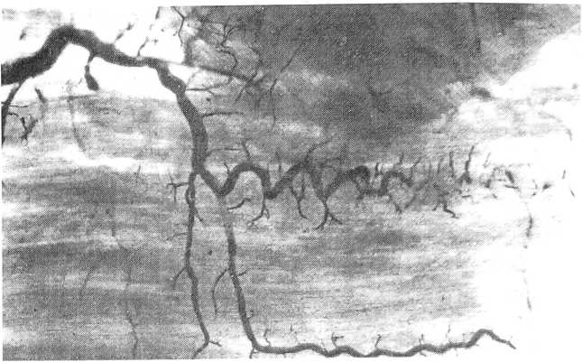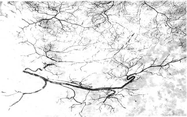 При этом красящая масса обнаруживалась и в забрюшинных лимфатических узлах. Довольно отчетливо контурировались вены, окрашенные в синий цвет, в области задней париетальной брюшины подвздошной области. В большинстве случаев это были немногочисленные продольно идущие сосуды, принимающие на всем протяжении боковые венозные стволы (рис. 6).