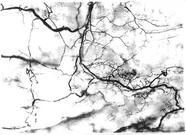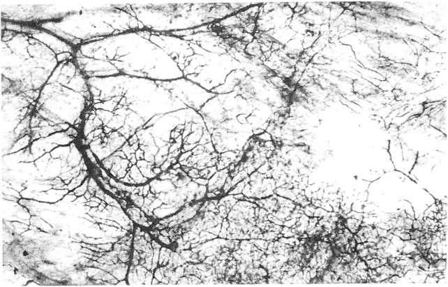 В подвздошной фасции среди вен, окрашенных красящей массой, преобладали сосуды, мелкие по калибру. Они представляли густую сеть мелких венозных стволов, занимающих почти всю поверхность подвздошной фасции (рис. 4).