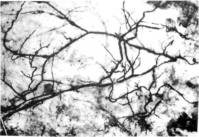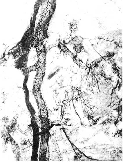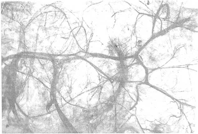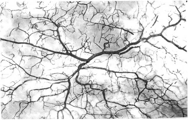 В нескольких опытах иньецированные сосуды были представлены сетью крупных и мелких вен, занимающих значительную поверхность париетальной брюшины этой области (рис. 1). Красящая масса определялась также в венах клетчатки малого таза, а именно: различные по калибру вены выявлены в клетчатке боковых отделов таза (рис. 8). В основном это были венозные стволы бассейна подчревной вены. Из других тканей следует отметить заполнение массой Герота-Акиловой вен околоматочной клетчатки. Они были представлены разветвленными венами в области заднебокового венозного сплетения матки (рис. 9).