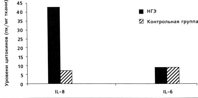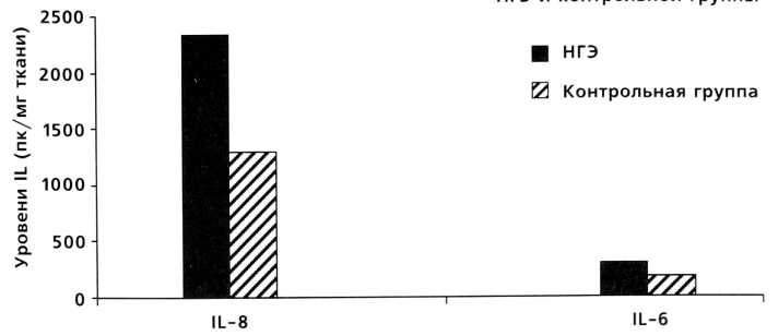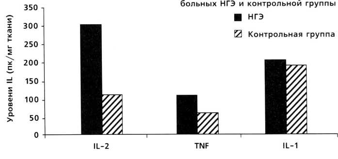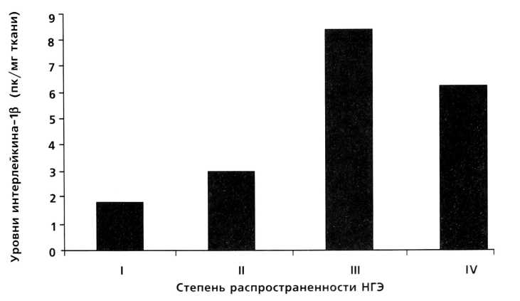 степени - 2,96 пг/мг, при НГЭ III степени - 8,4 пг/мг и при НГЭ IV степени - 6,18 пг/мг. IL-1 является одним из главных медиаторов, ответственных за развитие местной воспалительной реакции. Местная воспалительная реакция хотя и усиливается при переходе от «малых» форм НГЭ к более тяжелым, но, возможно, является недостаточной для регресса болезни.