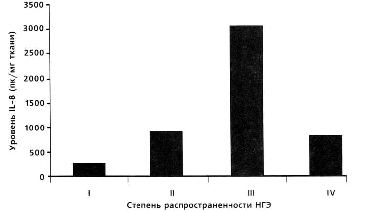 При изучении зависимости концентрации IL-8 от степени распространенности процесса, выявлено его максимальное значение при III-ей степени заболевания, т. е. при переходе от начальной стадии в более тяжелую, при которой усиливаются пролиферативные процессы. В то же время снижение уровня IL-8 при IV степени НГЭ может свидетельствовать о снижении или истощении резервных секреторных возможностей иммунокомпетентных клеток.