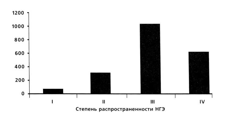 Изменения содержания в зависимости от степени распространенности НГЭ выявлены в отношении IL-1ß (рис. 3). Так, при I степени НГЭ уровень IL-1(3 составил 1,8 пг/мг, при НГЭ II